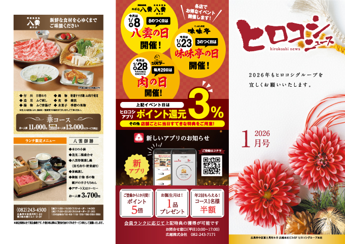 ヒロコシグループ各店の、おすすめグルメ情報『ヒロコシニュース2026 1月号』を