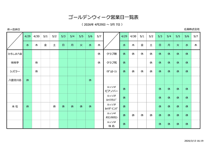 平素は、ヒロコシグループ各店をご愛顧頂き厚く御礼申し上げます。 さて、当グループは、ゴールデンウィーク中、下記のとおり 休業させて頂きますので宜しくお願い申し上げます。 尚、店休中のインターネットでのご予約は、店休明けよりの対応となりますので、 予めご了承頂けますようお願い申し上げます。